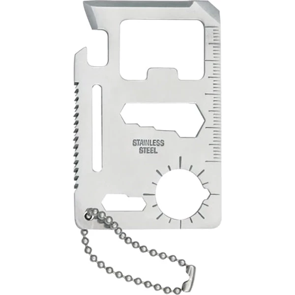 Measures 2 3/4″ x 1 3/4″. Stainless construction. Can be used as can opener, knife edge, screwdriver, ruler, cap lifter, wrench, butterfly wrench and saw blade. Lanyard hole.