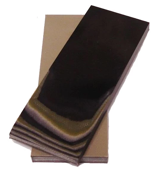 Dimensions: 4″ x 1.5″ x .25″. G10 handle. Black, tan, OD green. Contains two slabs. Item pictured has been ground to show layers.