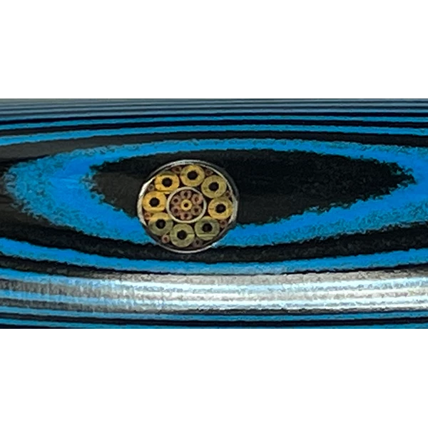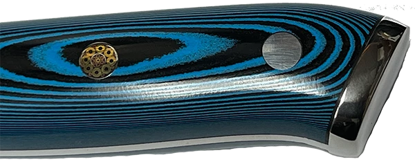 The handles are made out of Laminated and dyed wood and are professionally fitted to the knife blank. These handles are extremely stable. They are attached with 2 standard pins and one intricate mosaic pin. These Highly polished knives will look great in your kitchen.