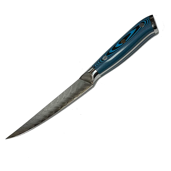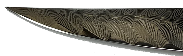 Made from folded VG10 this Damascus knife is elegant and unusual. The steel is folded to show a delicate feather on the blade. The knife is polished to a mirror finish not only bringing out the folds but accentuating the hammered area. It’s integrated bolsters provide a smooth, sturdy flow to the handle area. Blank comes in an attractive gift box.