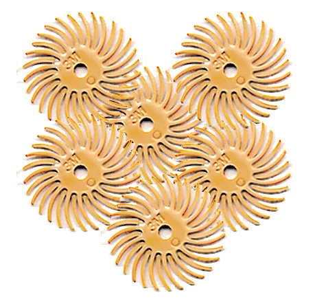 Individual discs are stacked to make a brush. Depending on the application, you will want to stack between three and six discs. Be sure to closely follow the directions in the package so that the discs are stacked and mounted properly onto a handpiece or the bench lathe.