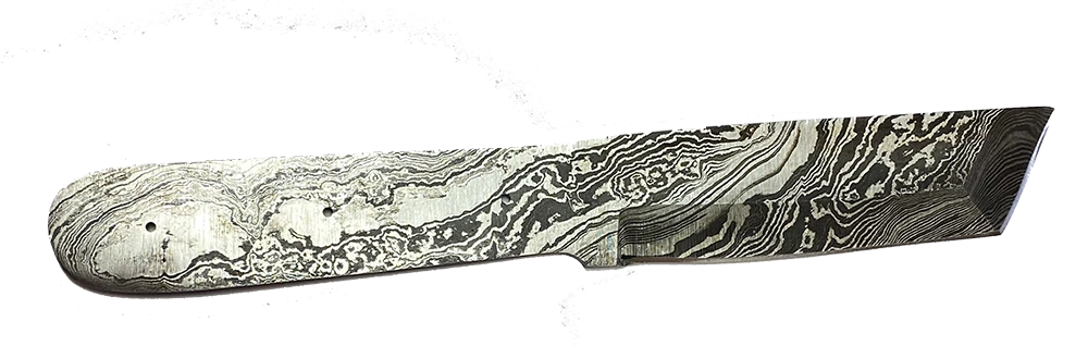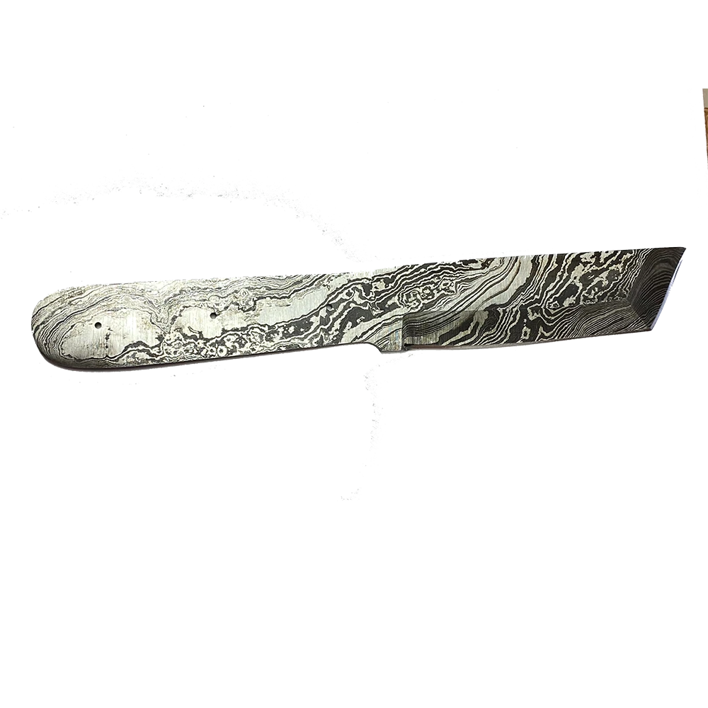 These blanks are full length Damascus (Not the cheap etched blades that many people are passing off as genuine Damascus blades. These blades have a 1095 high carbon & 1520 Stainless Steel with a high nickel content to highlight the patterns. There are approx. 250 layers due to folding of the steels. These blanks will sharpen and hold an edge like mad. We recommend washing and drying after use and then placing a couple of drops of oil to prevent rusting (Food Safe Oil recommended). The Nickle makes for a high contrast between layers. You can bring out the contrast in areas that were not dipped (Gray areas – end of handle) with a mild acid mixture or by leaving it sit in a coke for 3-4 hours. Be sure to neutralize the acid, clean and oil before using. Do not try this until you read more about etching process on the front page of www.woodworldtx.com under Etching Damascus in the menu on the left of the page.