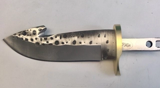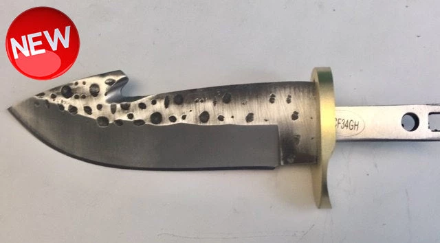 Great design hammered finished skinner. This blank is made of 7cr17MoV stainless steel, slotted fitted guard included and heavy construction. Sharpened blade and polished mirror finish. Great care was taken for the guard it is slotted so the blade can go inside the guard for tighter fit.Greater care is also given to the anchor hole you can use two different sizes of rod. Excellent blade. Drill, epoxy, shape and polish a real easy knife to start with. These were designed for our customers that want a great resell knife. Fit and finish is up to the maker.