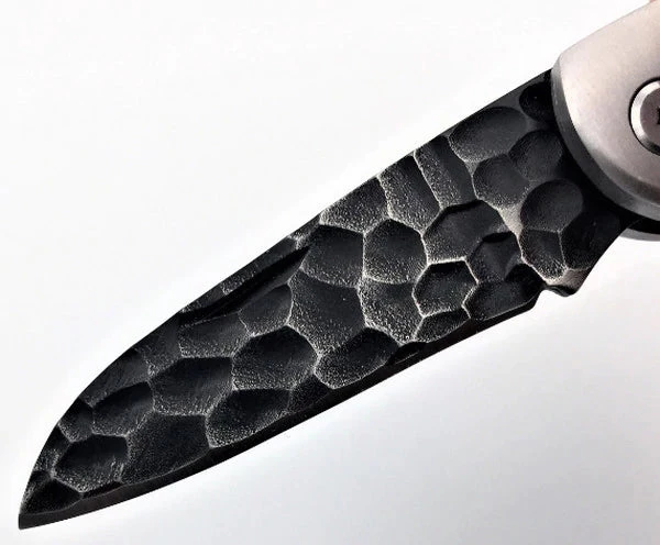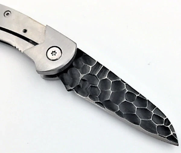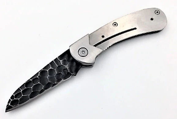 This tough little folder sports an unusual shaped utilitarian blade made via CNC. Each blade is ground individually. The knife just feels right in your hand. The blade has a CNC textured pattern finish and is made of high quality 7cr17MoV stainless steel with an RC rating of 57-58. Features a polished bolster and heavy steel frame, it comes sharpened and ready to use, just add your handle preference.