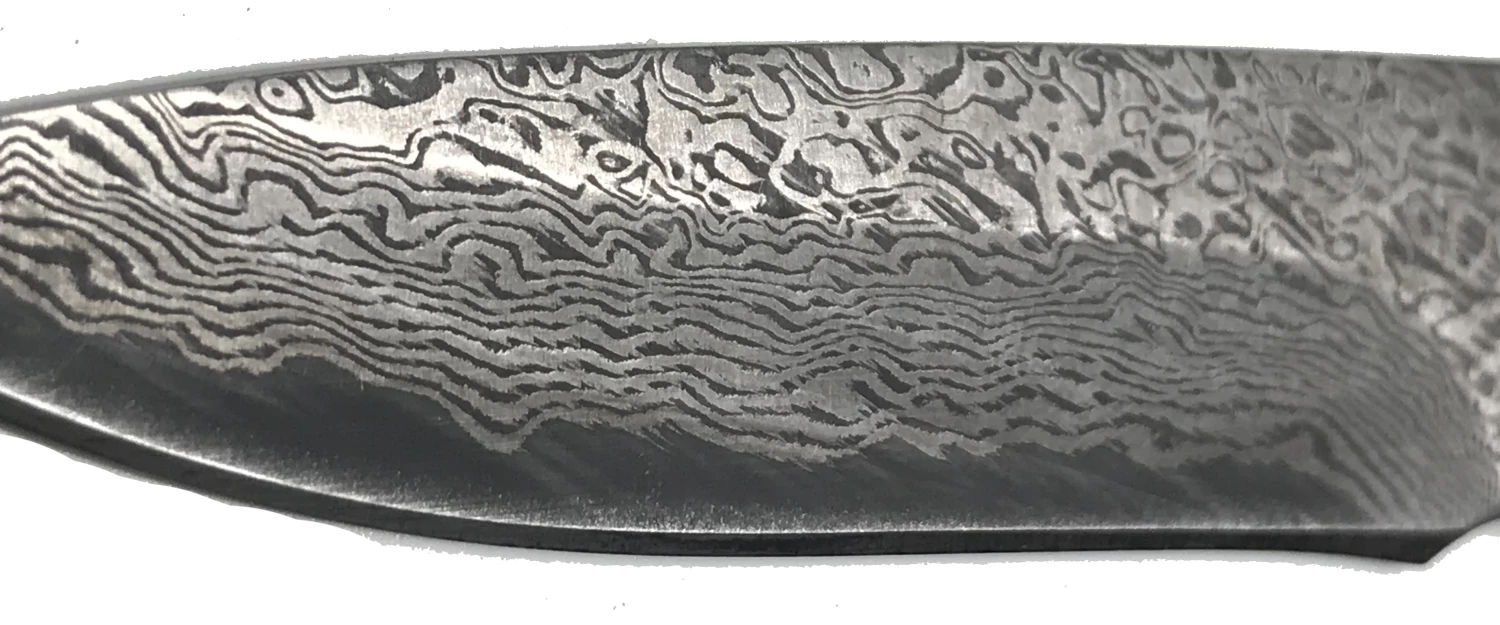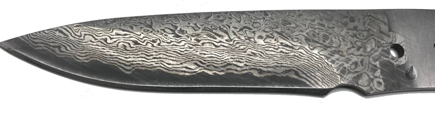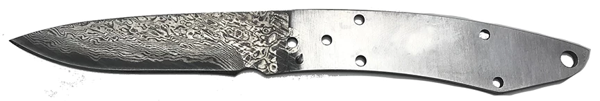 The SC Damascus is the most subtle, elegant, tightest and smoothest pattern of all Damascus blades, incorporating a welded steel handle. These bring the highest return on resell knives. This is an exclusive, high-end offering. Each grain pattern is slightly different—like a fingerprint. Very sharp and hardened. This blade is ready for handles.