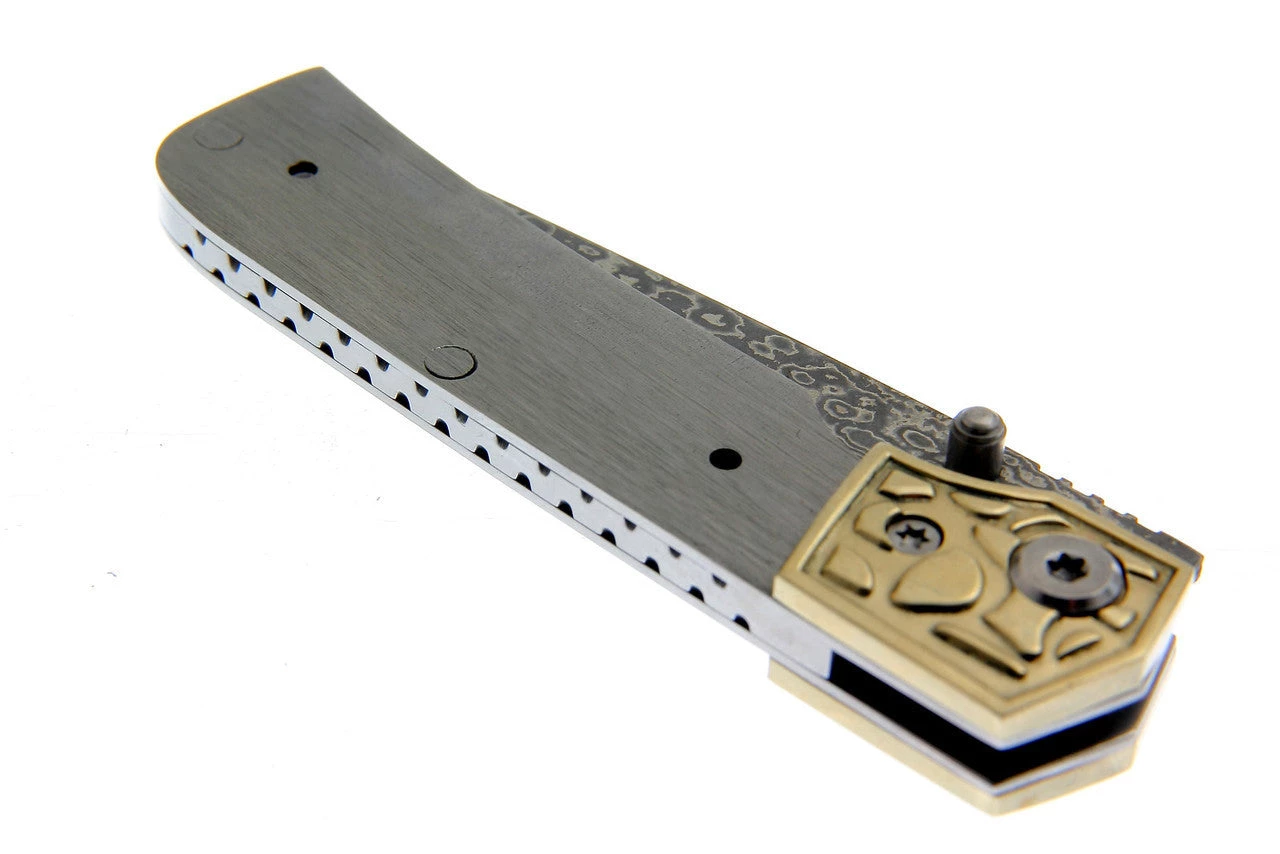 One of the nicest designs for high end knife finishing. This is a stainless laminated San Mai Damascus. Two stainless Damascus laminated on a core stainless steel. The Damascus is 67 layers. We attached copper nickel sculpted bolsters to accent the Damascus spine. Linerlock type mechanism. Attached thumb stud with upper spine thumb grooves and very sharp. Use rod or screws to fix handles.