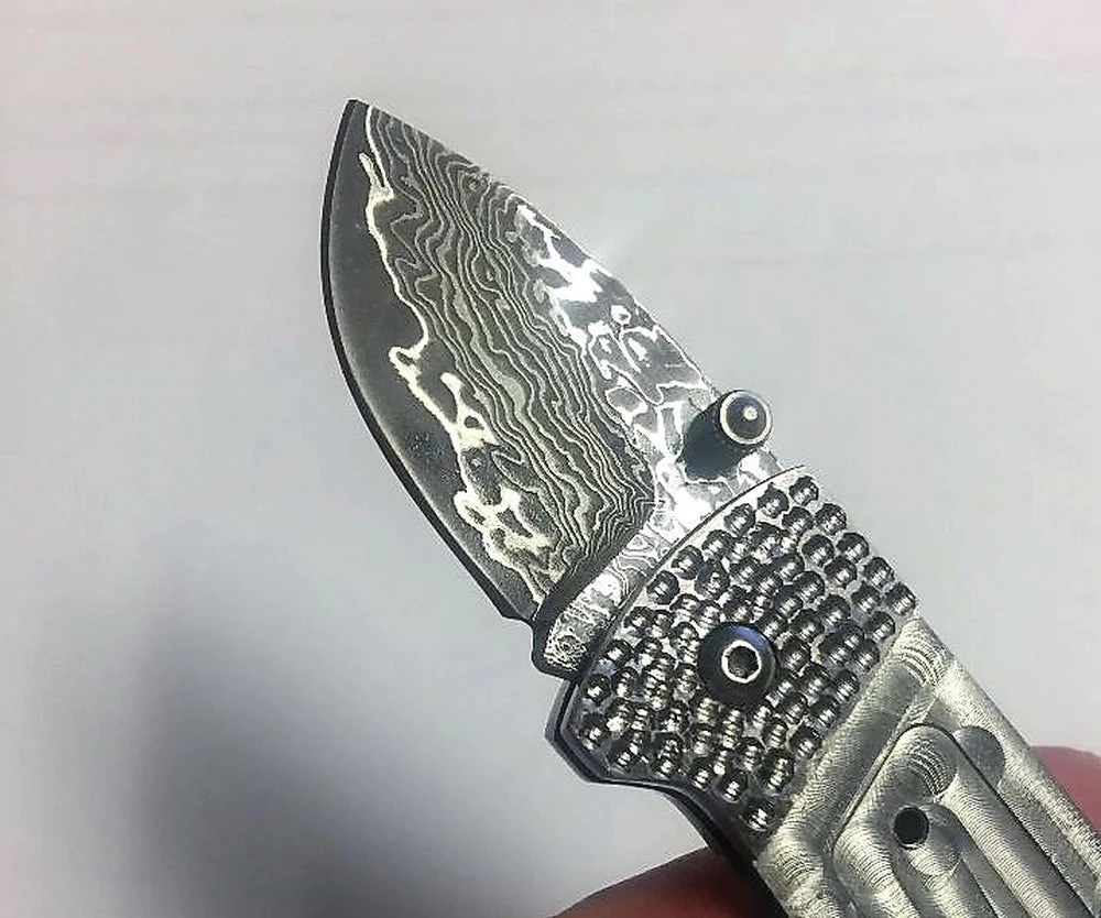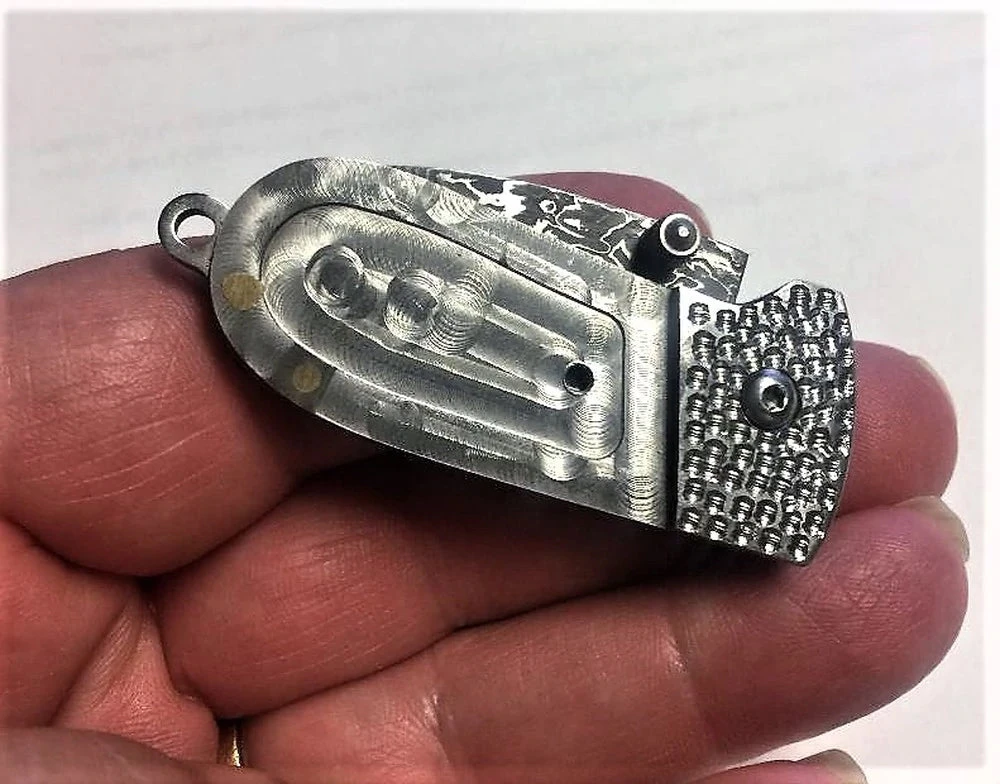 This lil Gem is a perfect gentleman’s pocket knife. Perfect when you need a pocket knife but not the size or the weight. This little gem is great for lapidary makers as well as custom knife makers. It is made of VG10 San Mai a stainless low maintenance Damascus steel, very sharp. It has an attached lanyard hole that can be sanded off if desired. Stainless distressed stippled bolster. Thumb stud. Handle 1.5″ x .81″. Non Locking folder. Scales for this knife can easily be made out of Gems or even from other small scrap material.