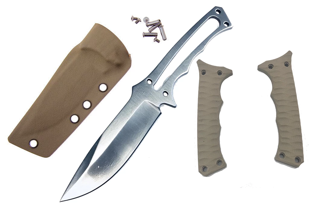 This is an important knife for the knife maker, tactical user and survivalist alike. It is a ultra lightweight drop point that weighs in at 2 ounces. Made of D2 tool steel with a Satin Finish finish. This acid dip process leaves a very effective neutral color and corrosion resistant finish. It has both an upper thumb stop and lower finger protection. Includes a screw system for included G10 handles and a fitted Kydex sheath. Already hardened and sharp!