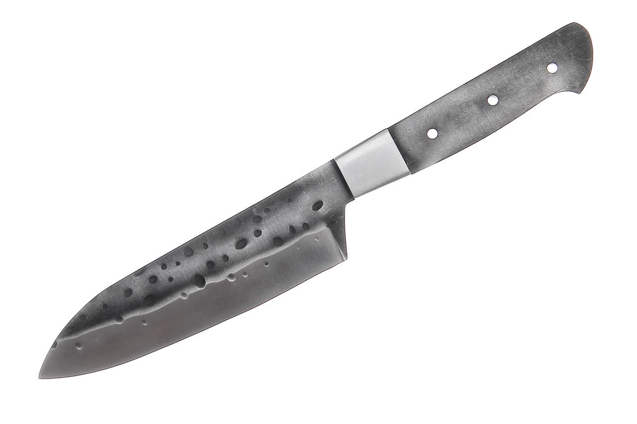 Each is handmade and the hammer pounded metal edge is reminiscent of the original meteorite blades. An extremely sharp knife, with an attached stainless steel bolster. This knife has weight, and is heavily constructed for years of use. This knife holds an edge and is a perfect companion for our Santoku Paring Knife
