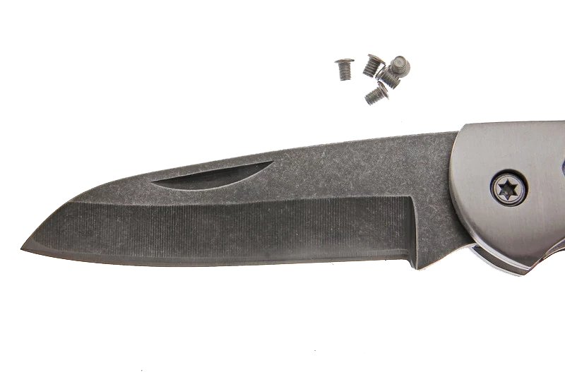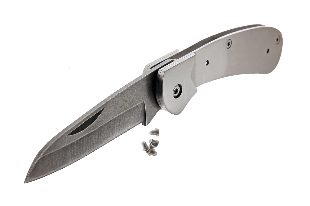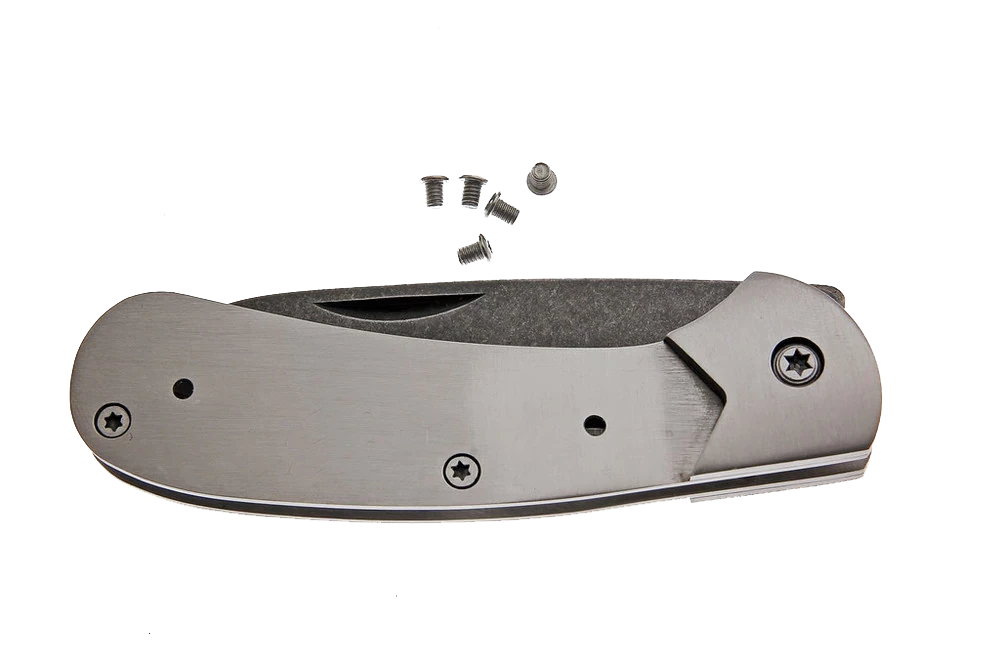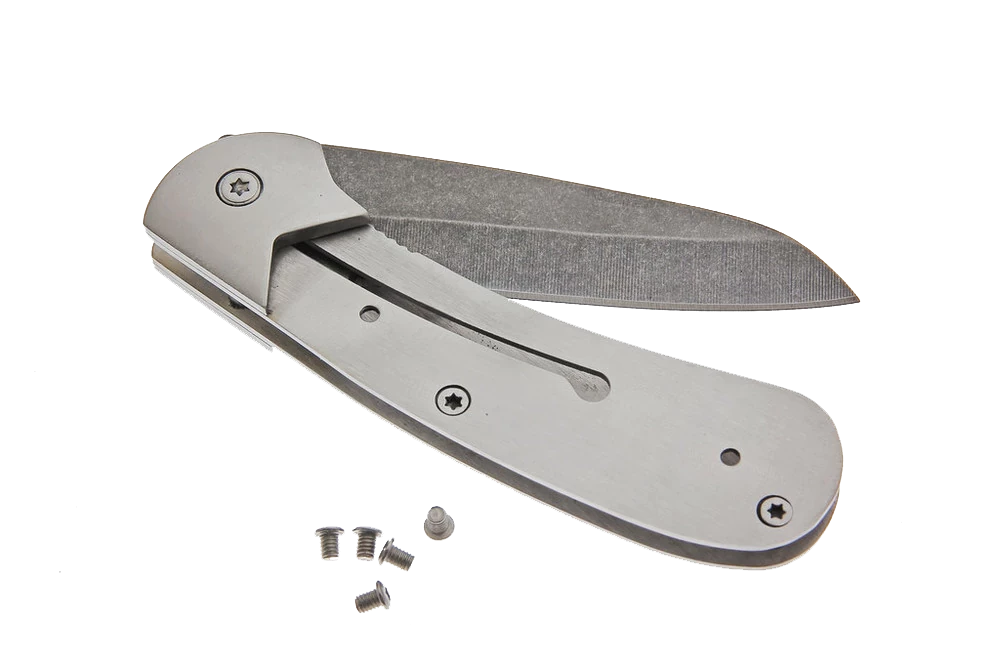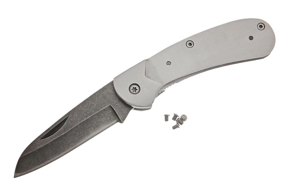 This tough little folder sports an unusual shaped utilitarian blade. The knife just feels right in your hand. The blade has a stone wash finish and is made of high quality 7cr17MoV stainless steel with an RC rating of 57-58. Features a polished bolster and heavy steel frame, it comes sharpened and ready to use, just add your handle preference.