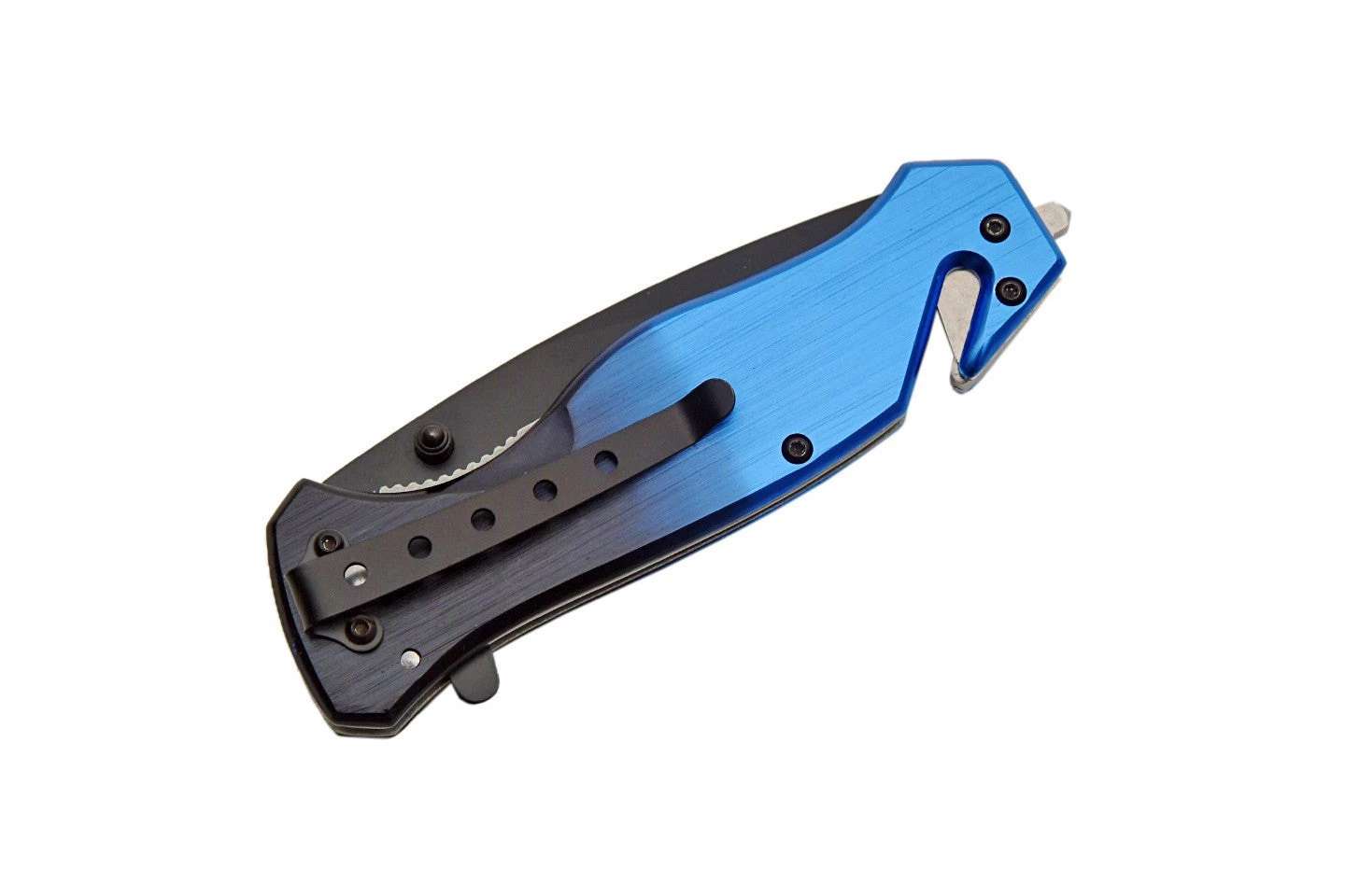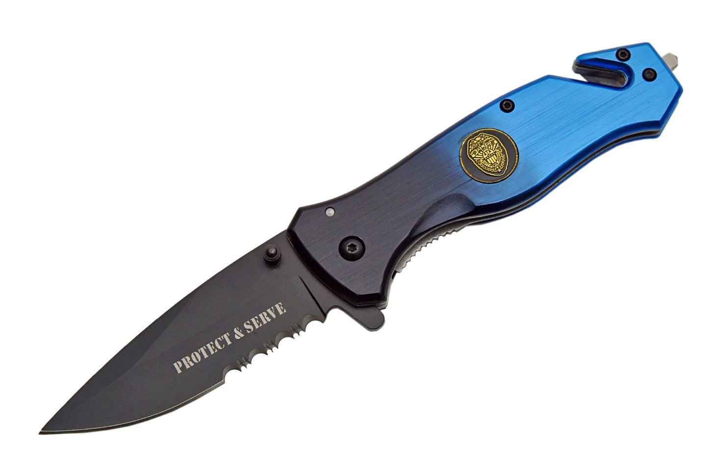 This is one classy all blue & black liner lock. The gold “Police” emblem and laser etched blade pops out against the black and blue aluminum handle. This logo conveys your pride and support of all those Law Enforcement professionals out there. In addition to showing off support of Law Enforcement this liner lock knife is just as strong and durable as you are and will provide decades of dependable service.