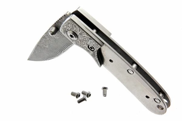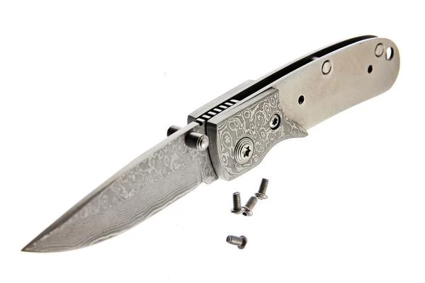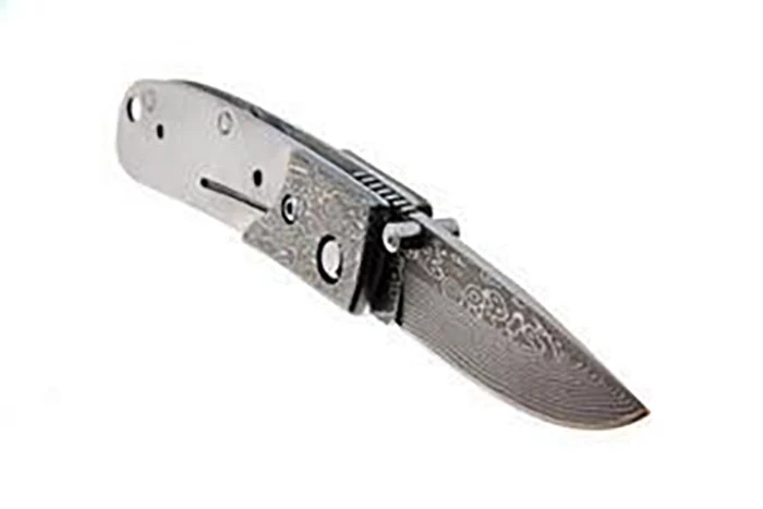 One of the nicest designs for high end knife finishing. This is a stainless laminated San Mai Damascus. Two stainless Damascus laminated on a core carbon steel. The Damascus is 67 layers. We attached Damascus bolsters to accent the spine. Liner lock type mechanism. Attached thumb stud with upper spine thumb grooves and very sharp. Use rod or screws to fix handles. Finished folder for example only, handle materials not included.