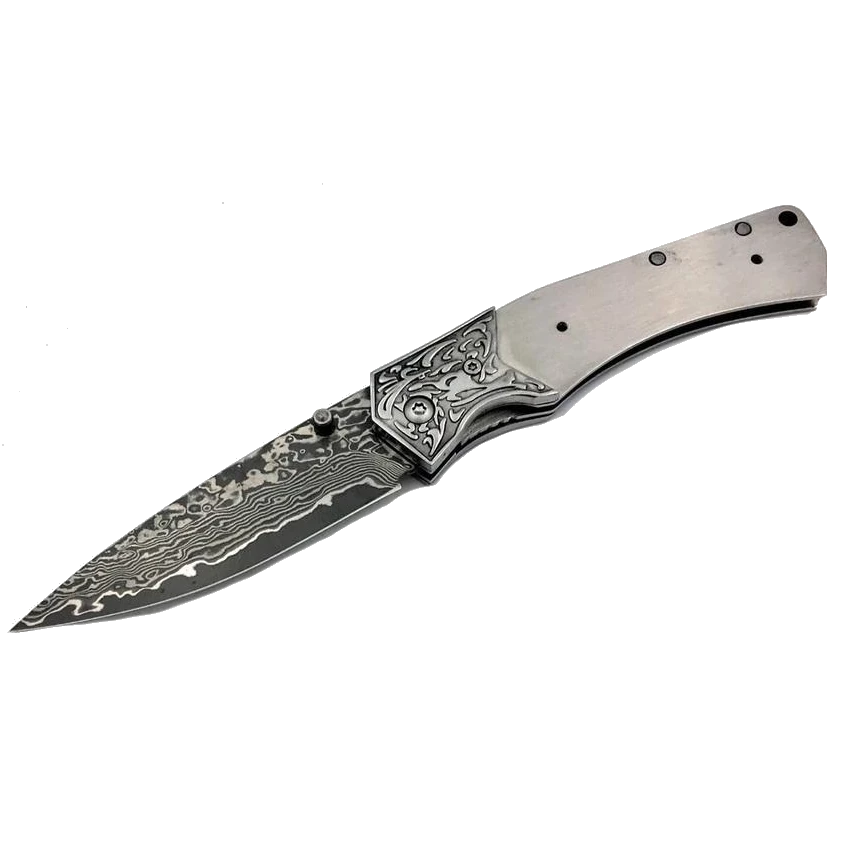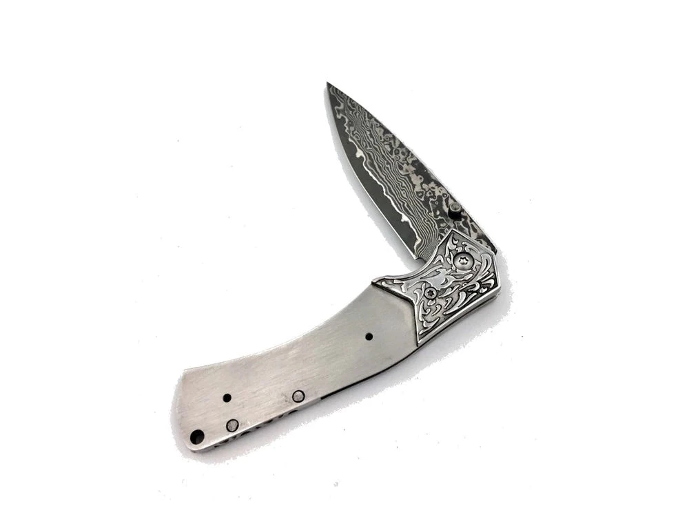 We attached stainless sculpted bolsters to accent the Damascus spine. Liner lock type mechanism. Attached thumb stud with file work on the spine and very sharp. Use rod or screws to fix handles.