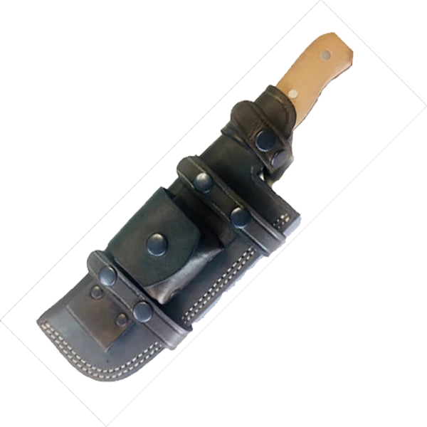 This Heavy duty cross draw sheath made for the SK16 Cutlass BBQ chef knife can be used by either left handed or right handed users. Designed primarily as a “Presentation sheath” for table display it can be cross drawn (for righties) from behind the back or right side. For lefties belly mount or left side. Versatile and includes a wet stone for sharpening and a separate holder for a fire starter if desired. Made of heavy duty saddle back Italian leather this impressive sheath makes your overall presentation a hog wild experience. The perfect storage for a great knife.
