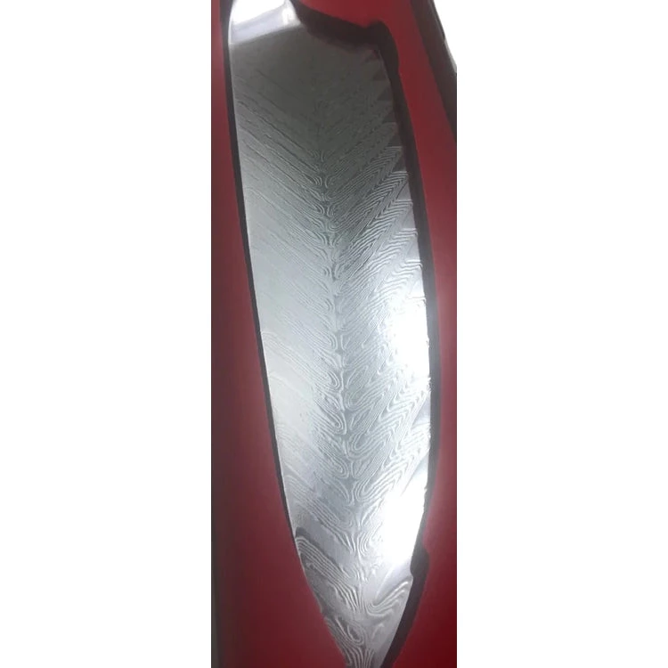 Made from folded VG10 this Damascus knife is elegant and unusual. The steel is folded to show a delicate feather on the blade. The knife is polished to a mirror finish not only bringing out the folds but accentuating the hammered area. It’s integrated bolsters provide a smooth, sturdy flow to the handle area. Blank comes in an attractive gift box.