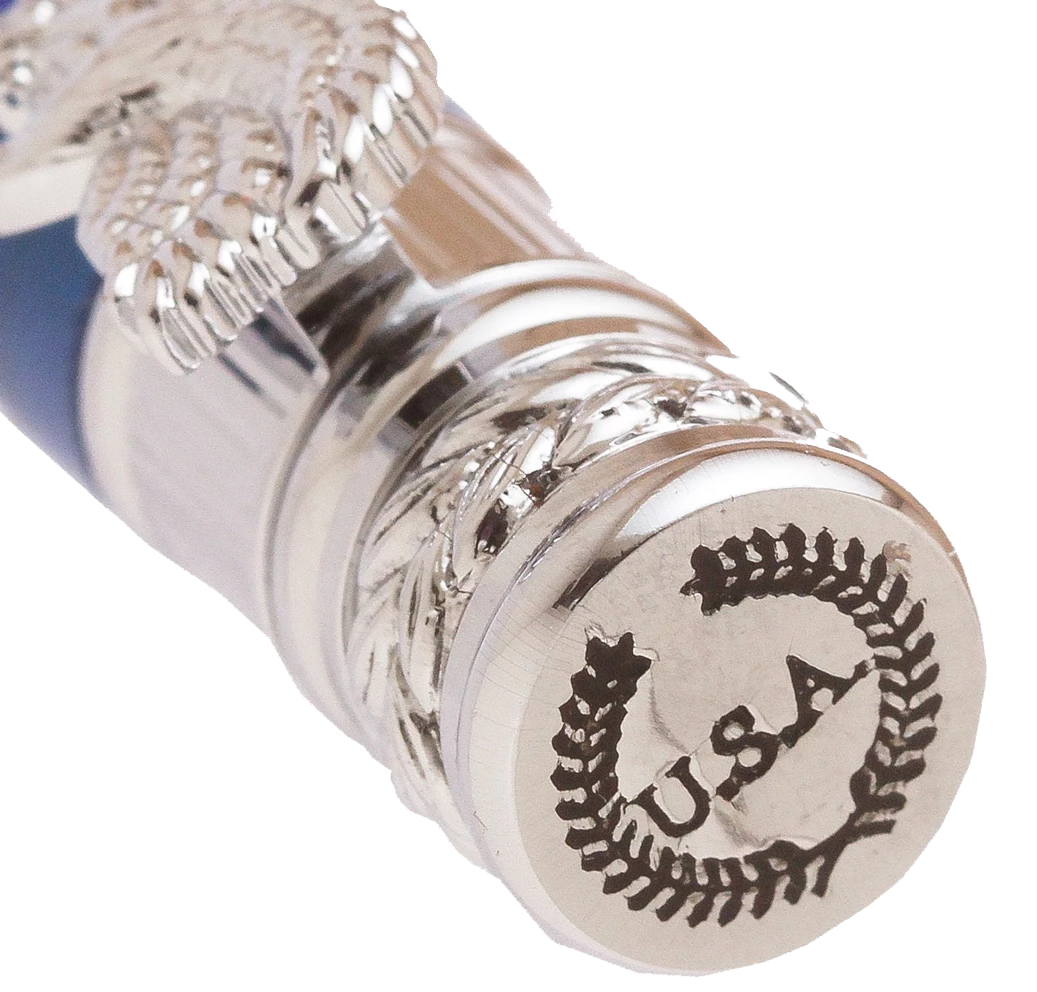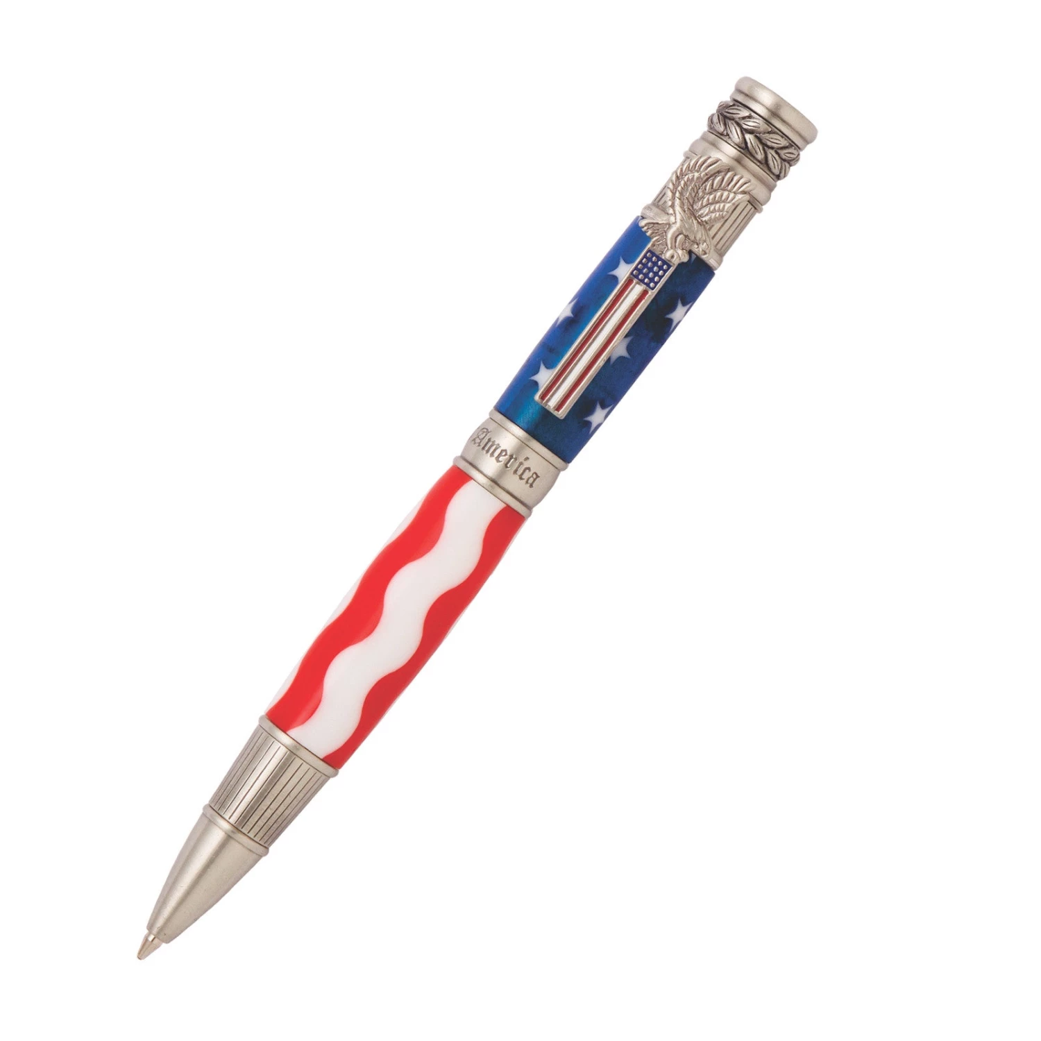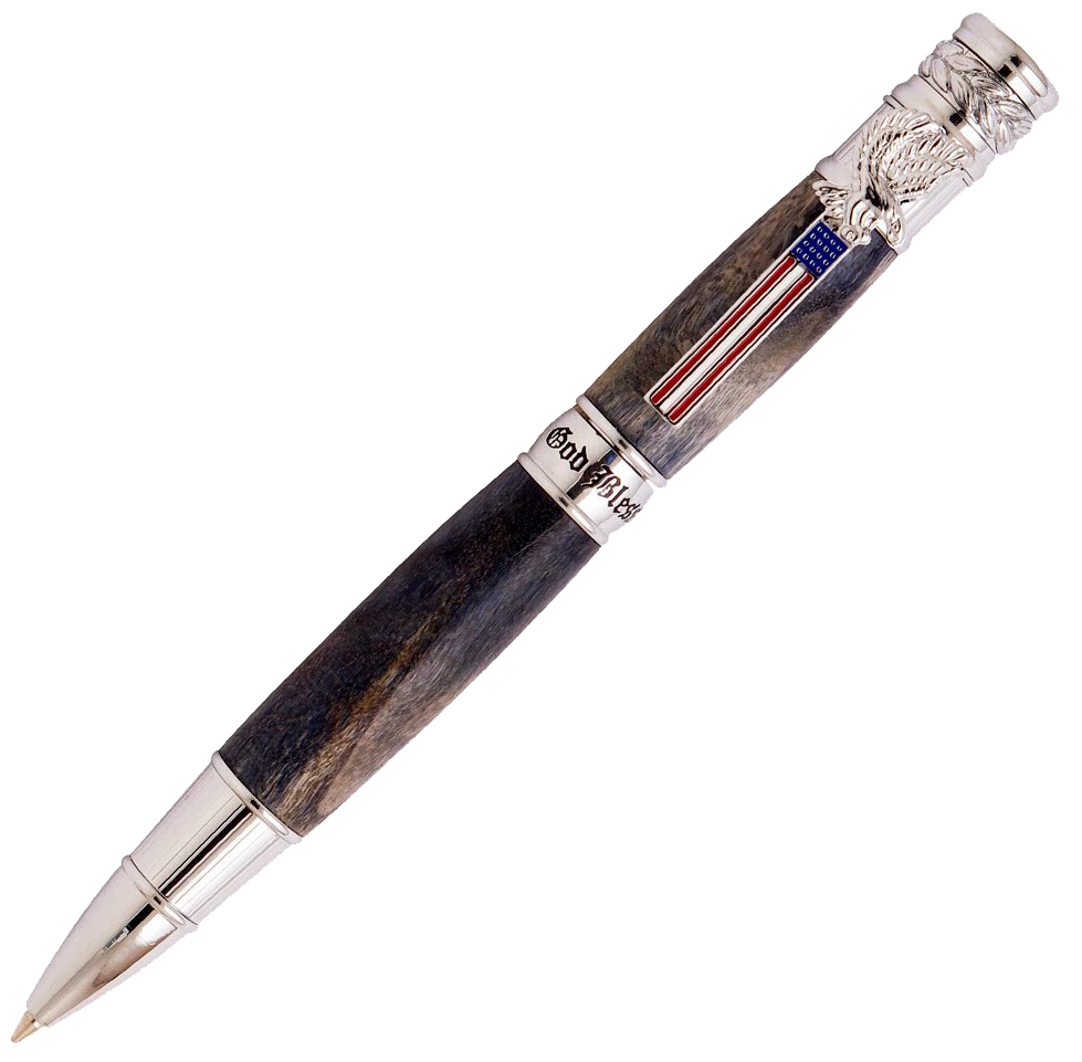 Proclaim your national pride and love of country with this most patriotic pen. Rich design details abound. The pen clip features a red, white and blue American flag and handsomely cast Bald Eagle emblem. The pen end features a laurel leaf, a symbol of victory and a popular motif in the Federal style of architecture. The pen top features an etched U.SA and laurel leaf stamp. Also on the tip and end are Doric column influenced designs, which appear on many American government buildings and monuments. Finally, God Bless America is intricately etched into the pen band. Excellent weight, balance and a smooth writing performance with a Parker style refill. Plus, the Antique Pewter finish is formulated to simulate the sophisticated sheen of time-worn pewter. The authentic patina and natural darkening brings out the details of the finish and creates a unique feel with a charm all its own. It will add a sense of warmth and history to your to your handmade creation.Required Accessories: