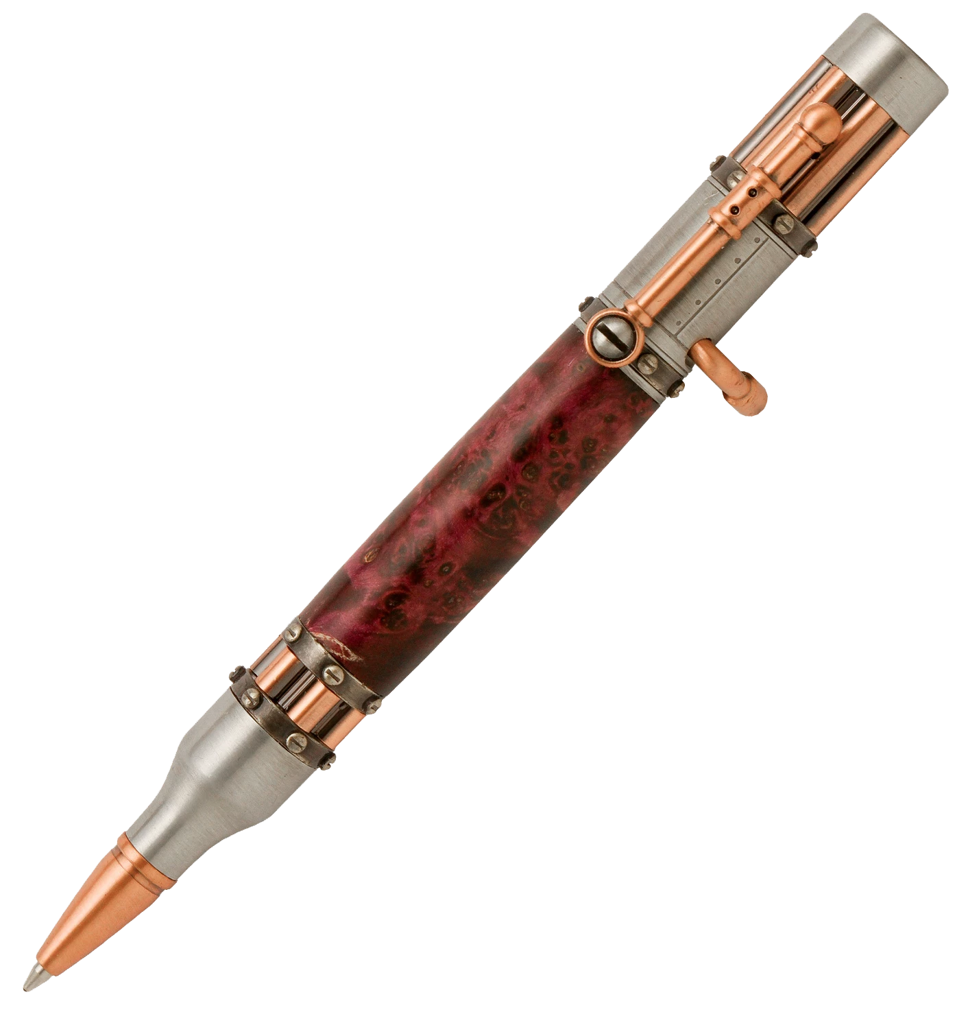 Here is a pen kit straight out of Victorian science fiction and the industrialized 19th century. The Steampunk genre has re-ignited a love of old fashioned materials and is all about mixing the old and new; fusing the usability of modern technology with the design aesthetic and philosophy of the Victorian age. We have designed our kit around this aesthetic; the kit combines flat head screws, riveted design patterns, replica Gattling gun barrels, a Bolt Action mechanism plus a mixture of industrialized Antique copper, pewter and brass finishes. Steampunk is a major trend in fashion, jewelry and design over the last few years – now is your chance to create the perfect pen as the ultimate Steampunk gift. Smooth writing performance with a Parker style refill.