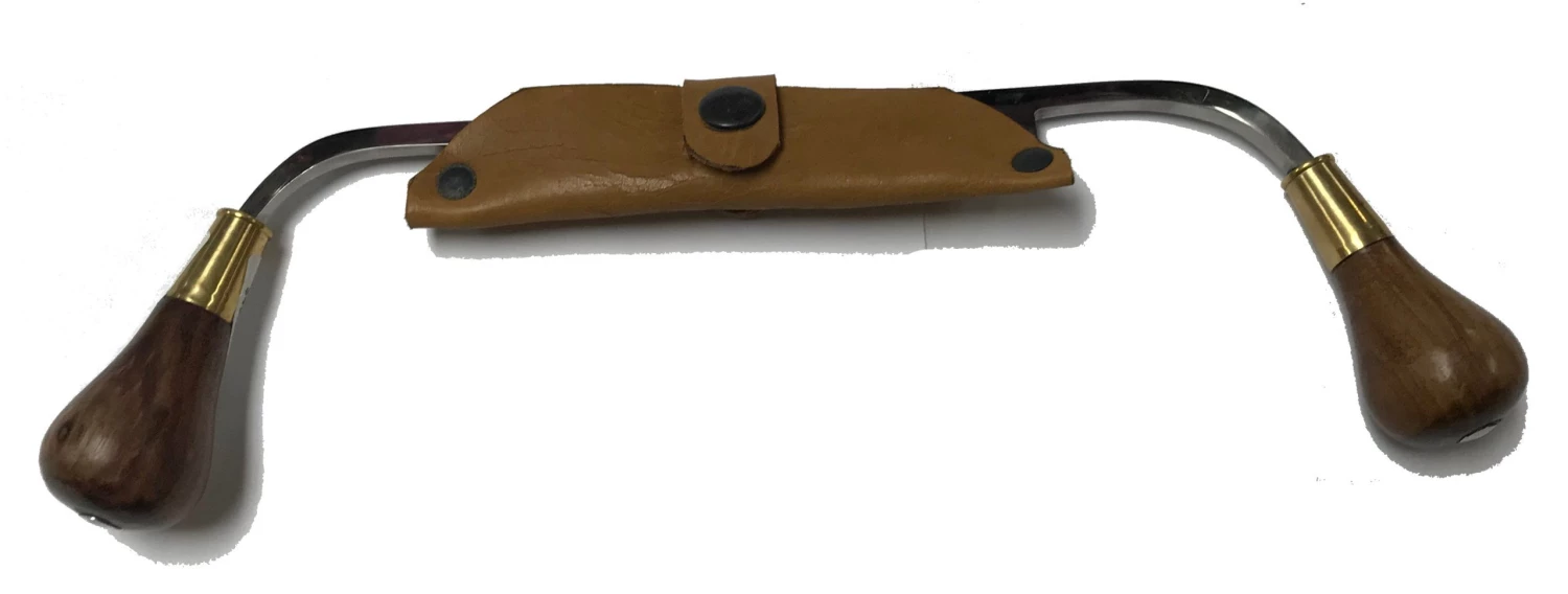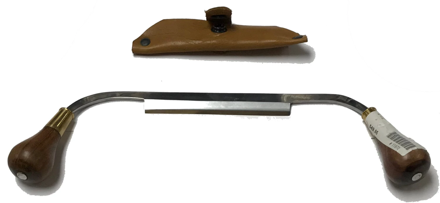This Carvers Draw Knife with Teardrop Handles is a good choice for cleaning up walking sticks, etc. It is quite sturdy despite its small size. Forged from quality high carbon steel, the blade has been hardened to RC-59-60. It will take and hold an extremely sharp edge. Blade size is approx. 4 5/8″ – 4 7/8″ x 1/8″ x 7/8″. Comfortable walnut shaped handles and they have been secured by a rivet through the tang for strength. Brass ferrule. Over all length is 12 1/2″. Comes with leather edge guard.