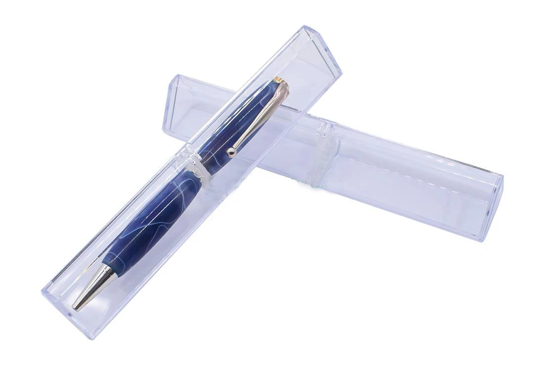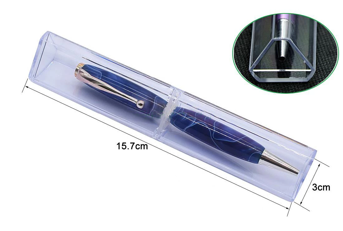 These clear plastic pen boxes are a great way to display a custom made pen as well as a great way to add value to a wonderful gift. This triangle transparent pen box meassures 15.5*2.5*2.5cm / 6.10″ x 0.98″ x 0.98″
