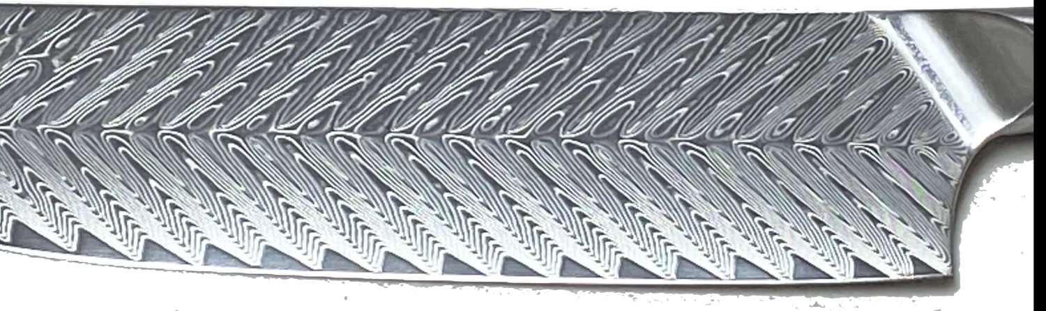 Made from folded VG10 this Damascus knife is elegant and unusual. The steel is folded to show a delicate feather on the blade. The knife is polished to a mirror finish not only bringing out the folds but accentuating the hammered area. It’s integrated bolsters provide a smooth, sturdy flow to the handle area. Blank comes in an attractive gift box.